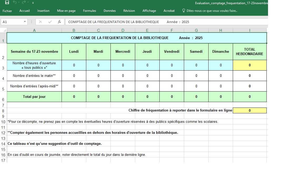 Du 17 au 23 novembre, chaque bibliothèque est invitée à compter le nombre de personnes entrant dans son établissement ; pour la faire courte, il s'agira de mesurer la fréquentation de la bibliothèque (et pas seulement le nombre d'emprunteurs). De manière manuelle ou sur un fichier Excel, la méthode est libre. Le Ministère met d'ailleurs un kit de comptage à disposition, que vous pouvez télécharger sur le site du Ministère.